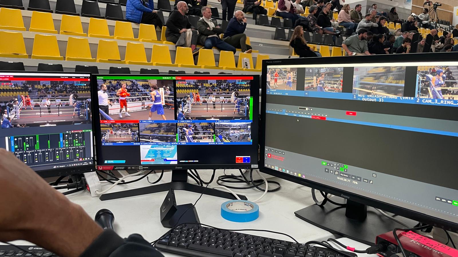 Pour capturer toutes les émotions de l'événement, nous avons déployé une régie vidéo vMix, deux caméras fixes, deux caméras HF bord de ring et un poste de commentateurs. Nous avons collaboré avec l'équipe suivante : un réalisateur spécialisé, un opérateur ralenti, trois cadreurs et deuxcommentateurs.
